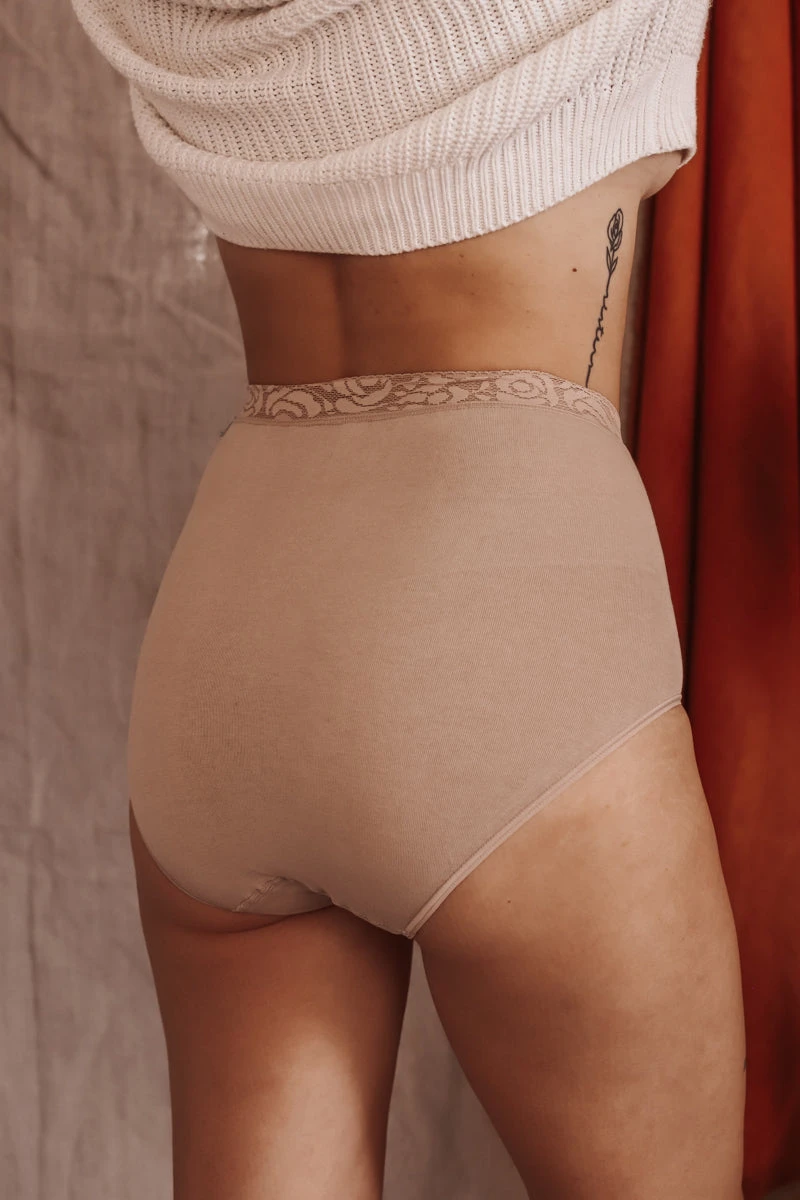 - Slip à taille haute en coton large à la taille et qui englobe bien la fesse.