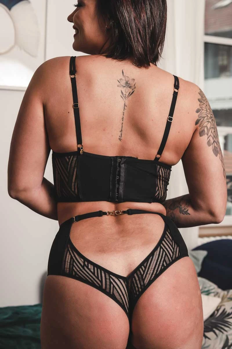 - Découpes en maille noires qui soulignent la taille