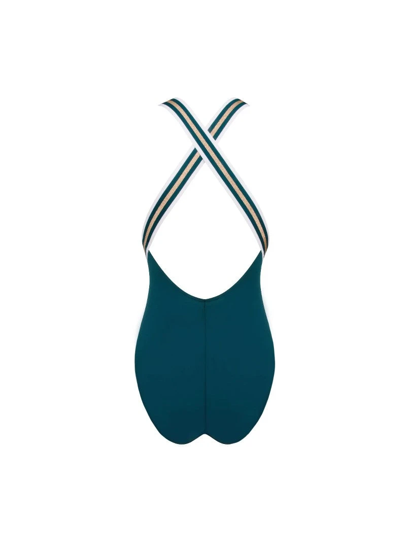 - Un élastique graphique aux touches cuivrées souligne et affine la silouhette en sublimant le décolleté, les bretelles croisées et la taille du maillot.