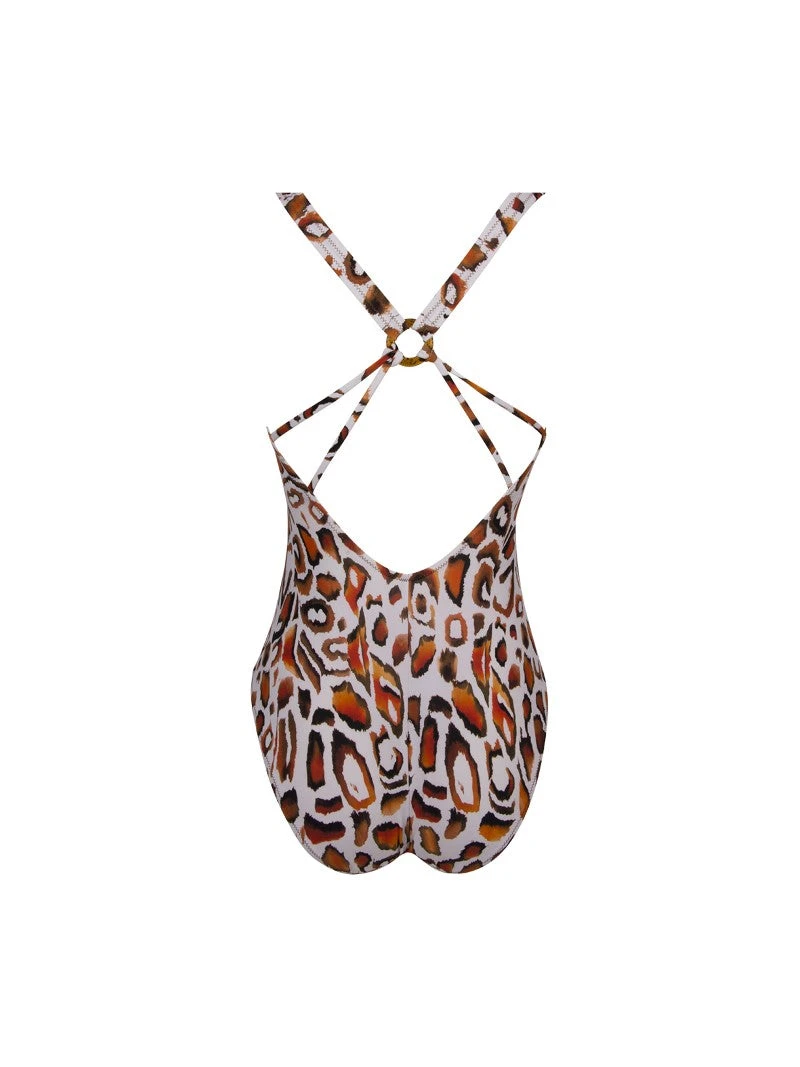 - Une pièce décolleté profond devant et dos en maille imprimée.