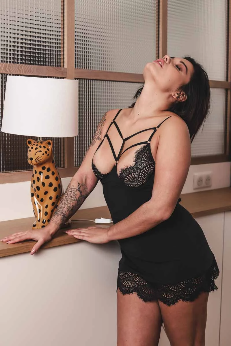 Une nuisette au décolleté plongeant, des liens fins entre les bretelles forment un dessin de plastron à dévoiler. Corps en crêpe, dentelle en finition basse et rappel du motif dans le creux des reins.