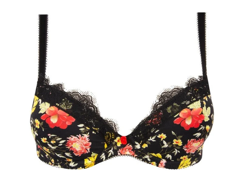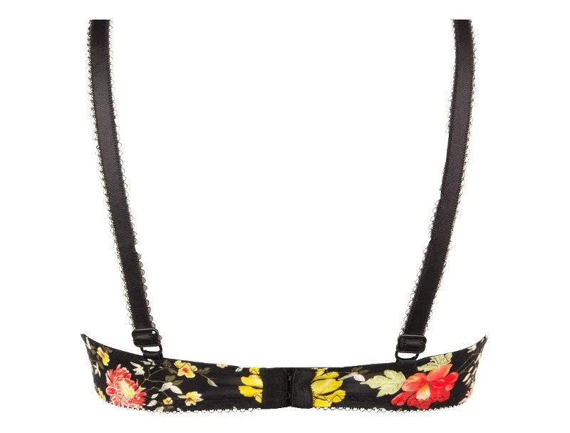 - Soutien-gorge coques Ă armatures en maille imprimĂ©e très douce. Incrustation d’une dentelle barbe au dĂ©colletĂ©.