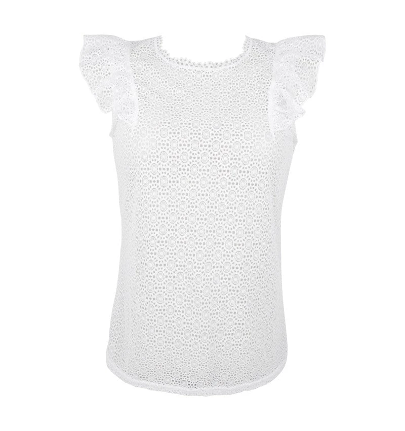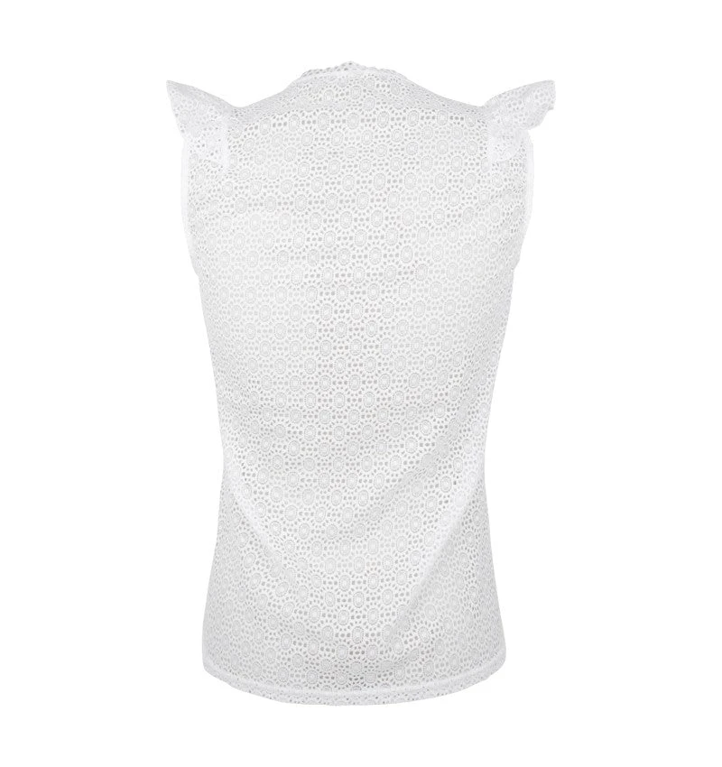 - Top sans manches en dentelle, encolure enrichie d’une bordure fantaisie.